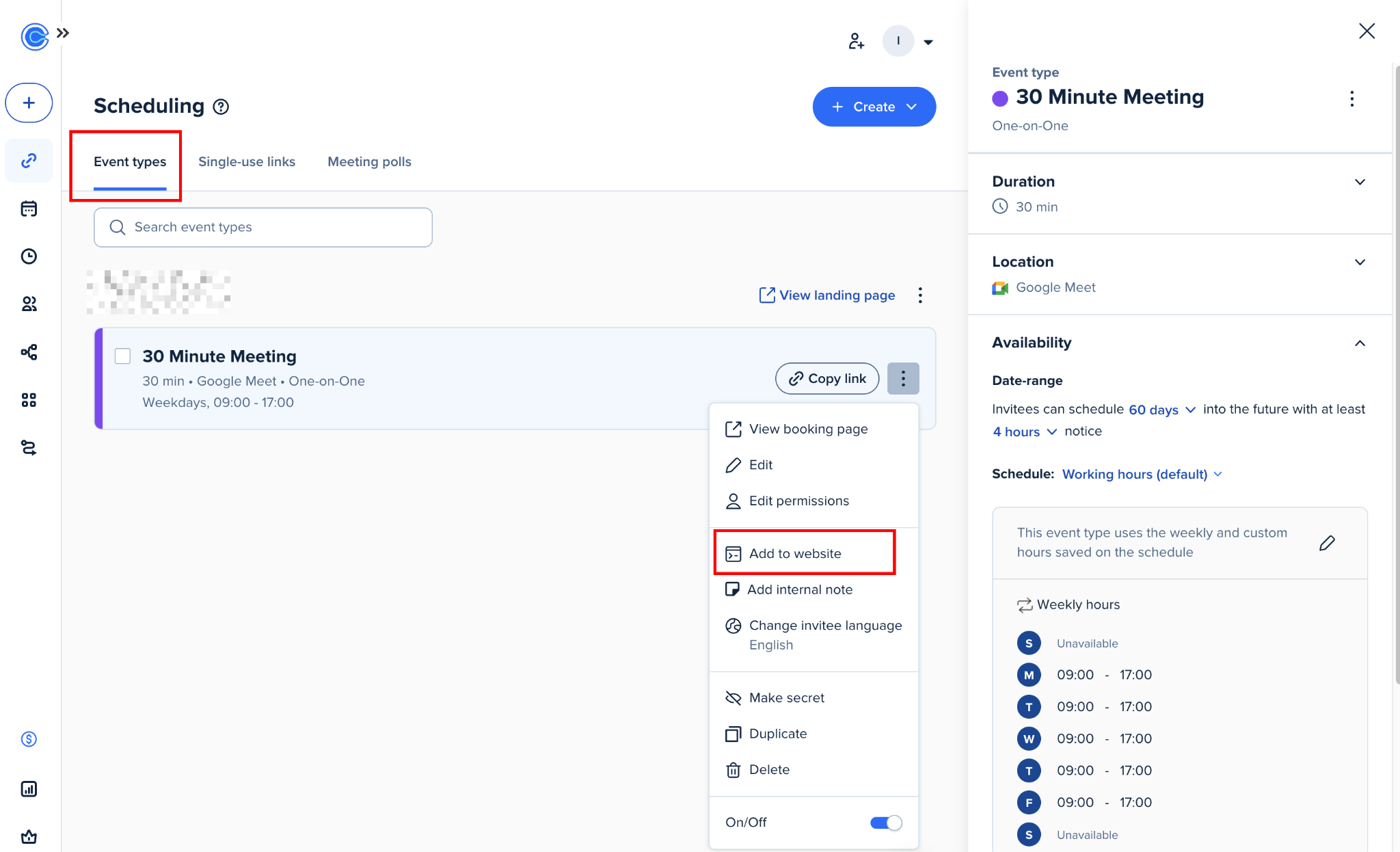 In the Event Type settings, look for the "Add to Website" section in the left sidebar.