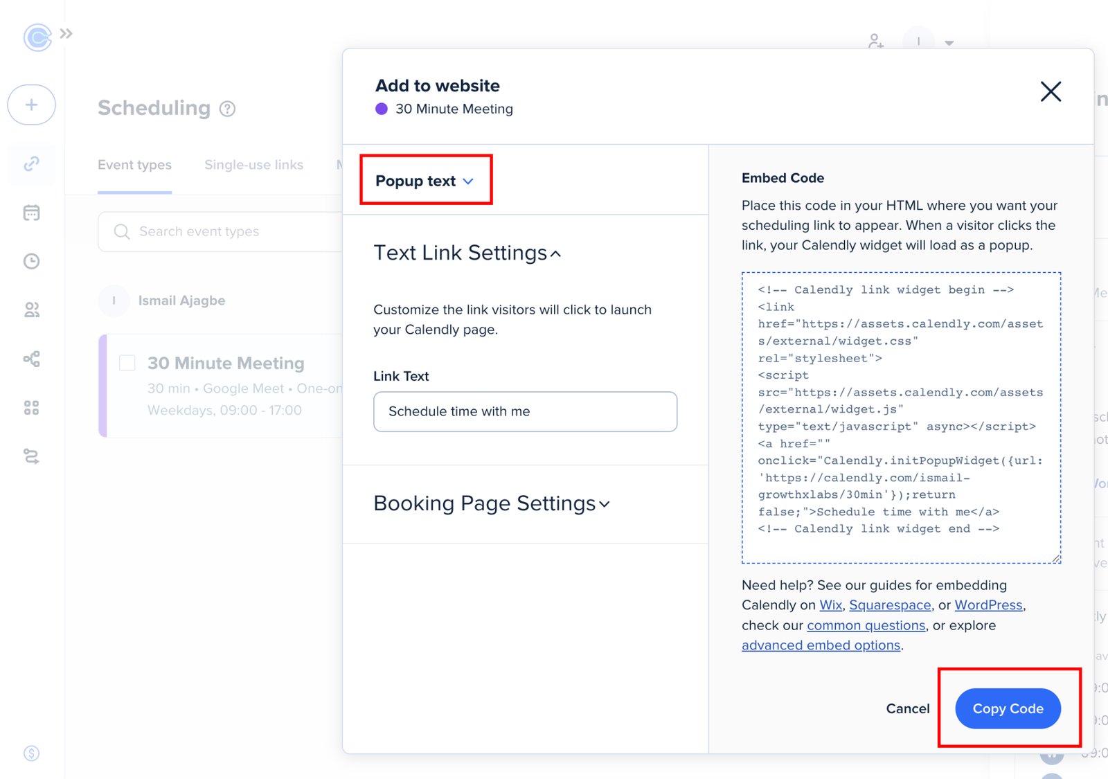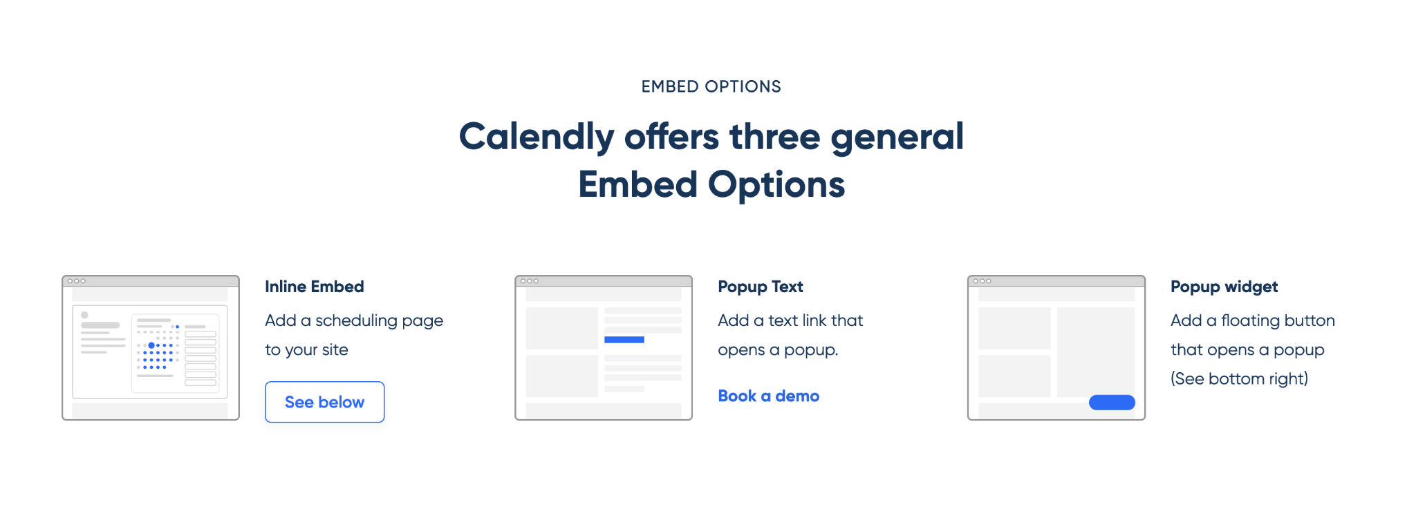 Click it, and you'll see Calendly's three embed options: Inline Embed, Popup Widget, and Popup Text.