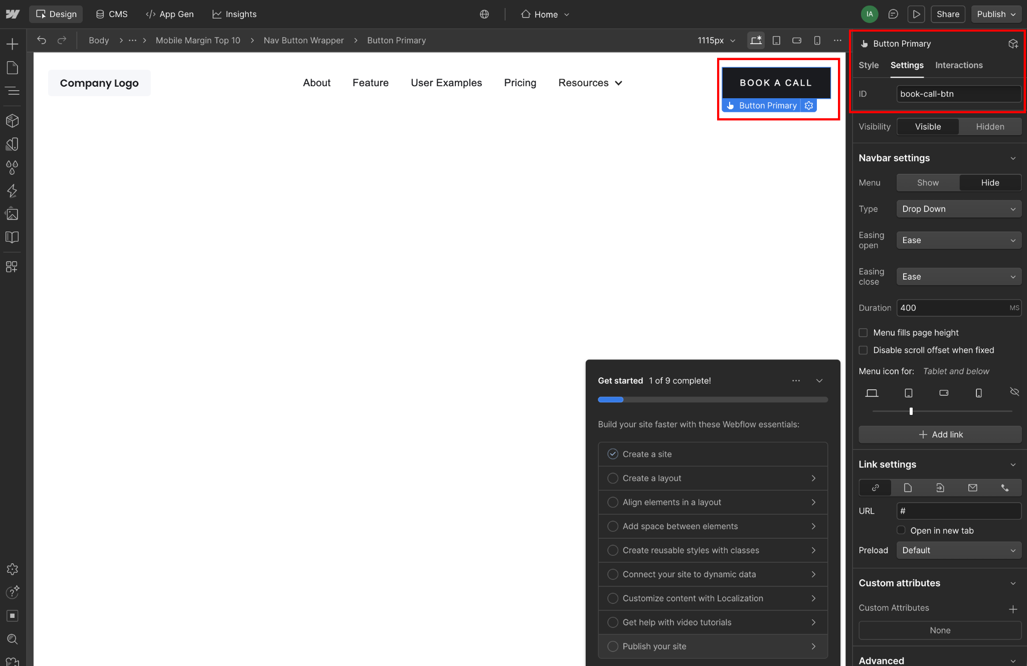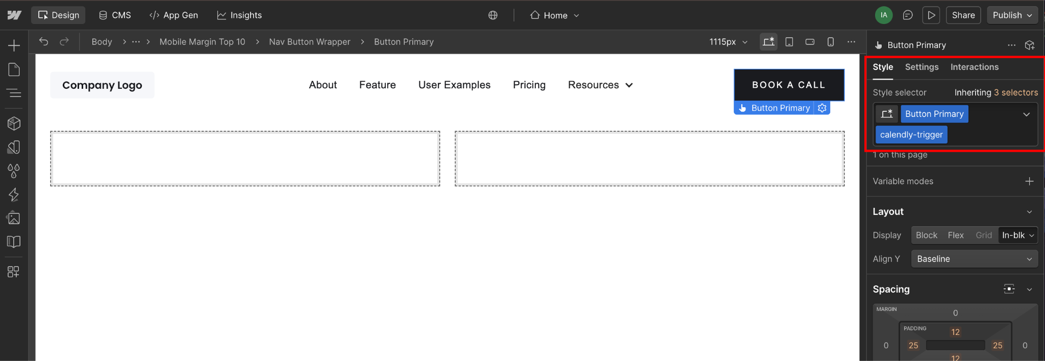 If you already have a "Book a Call" or "Schedule Demo" button in your Webflow design, you can use that. If not, drag a Button element from the Add panel onto your page wherever you want the booking CTA to appear, e.g., the hero section, pricing table, or footer, whichever makes sense for your layout.