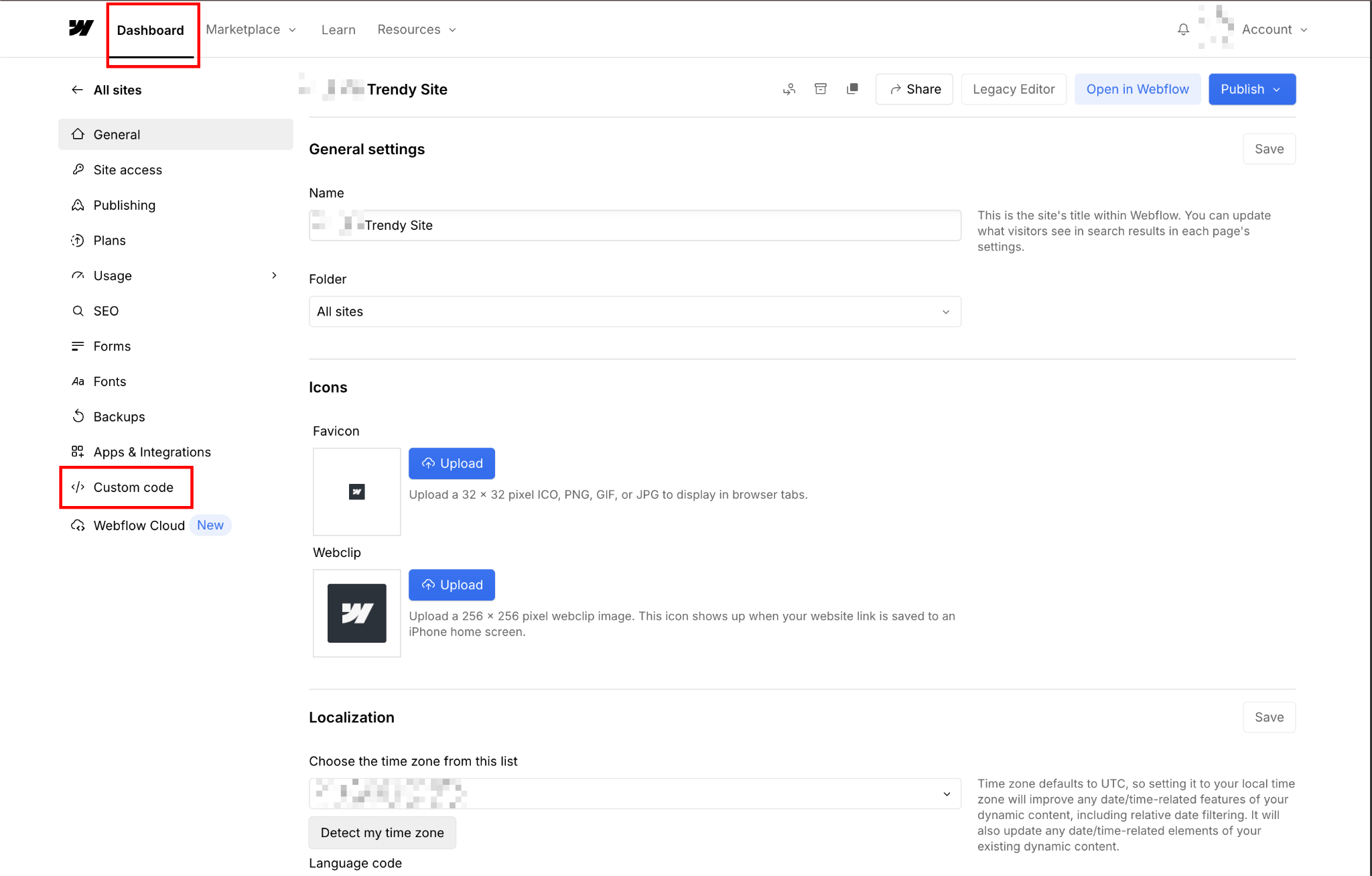 You'll see a list of settings categories. Look for "Custom Code" and click it. This is different from page-level settings (where you'd add code to specific pages) or the Embed element (where you'd add code inline in your design).
