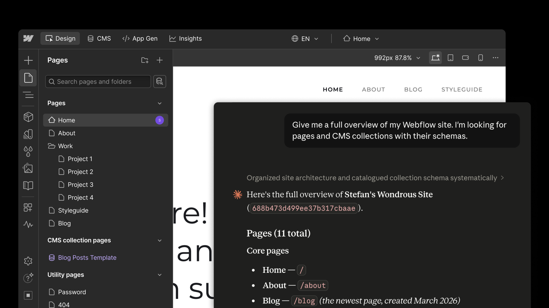 You can quickly access all pages (even the ones you might have forgotten about) and all the CMS collections and entries. There's no need to click around; Claude can do this job for you!