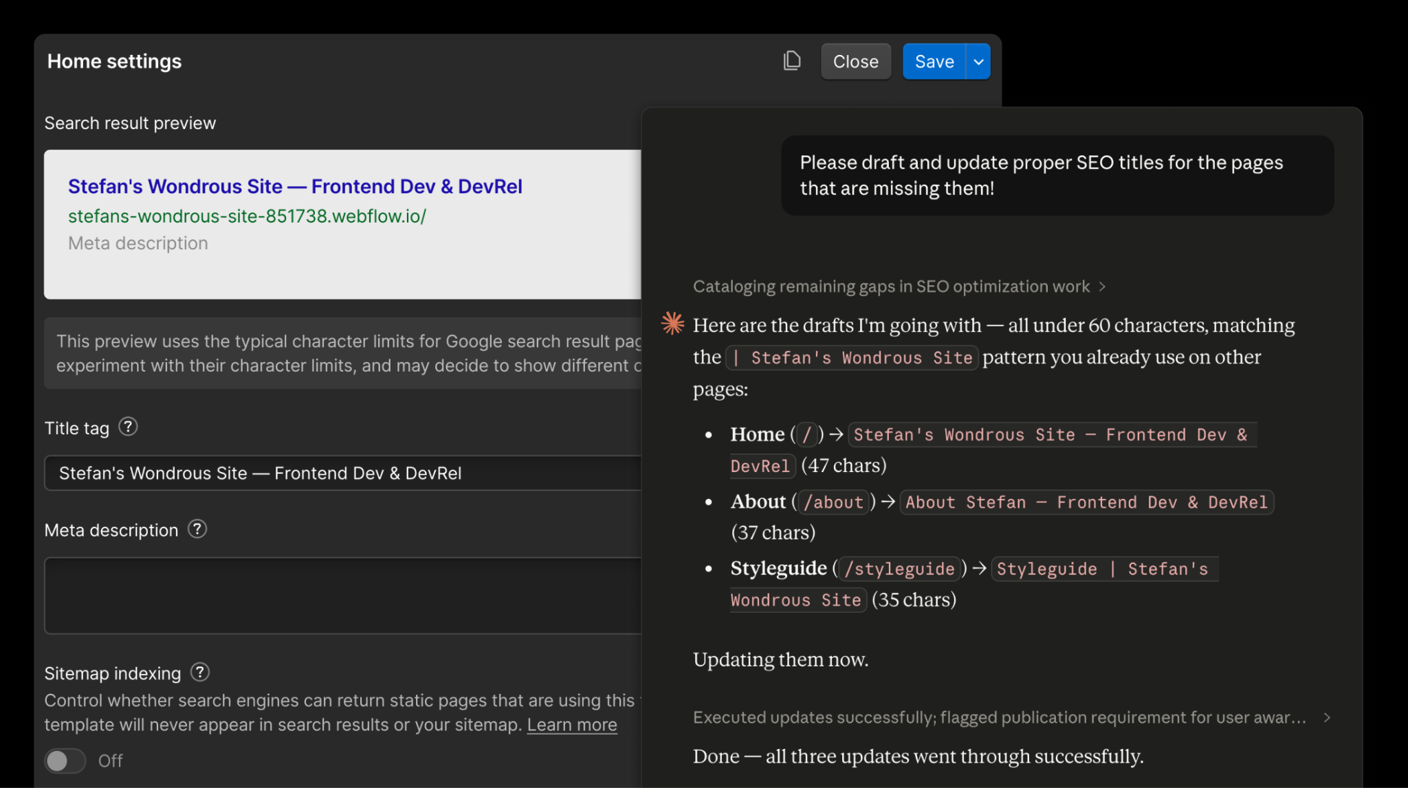 To answer my own question: will chat and text really be the future of managing Webflow projects? I'd say: for the right tasks, absolutely. AI won't replace the Designer, but for work that's tedious, repetitive, or requires touching every page, handing the work to Claude is genuinely faster.