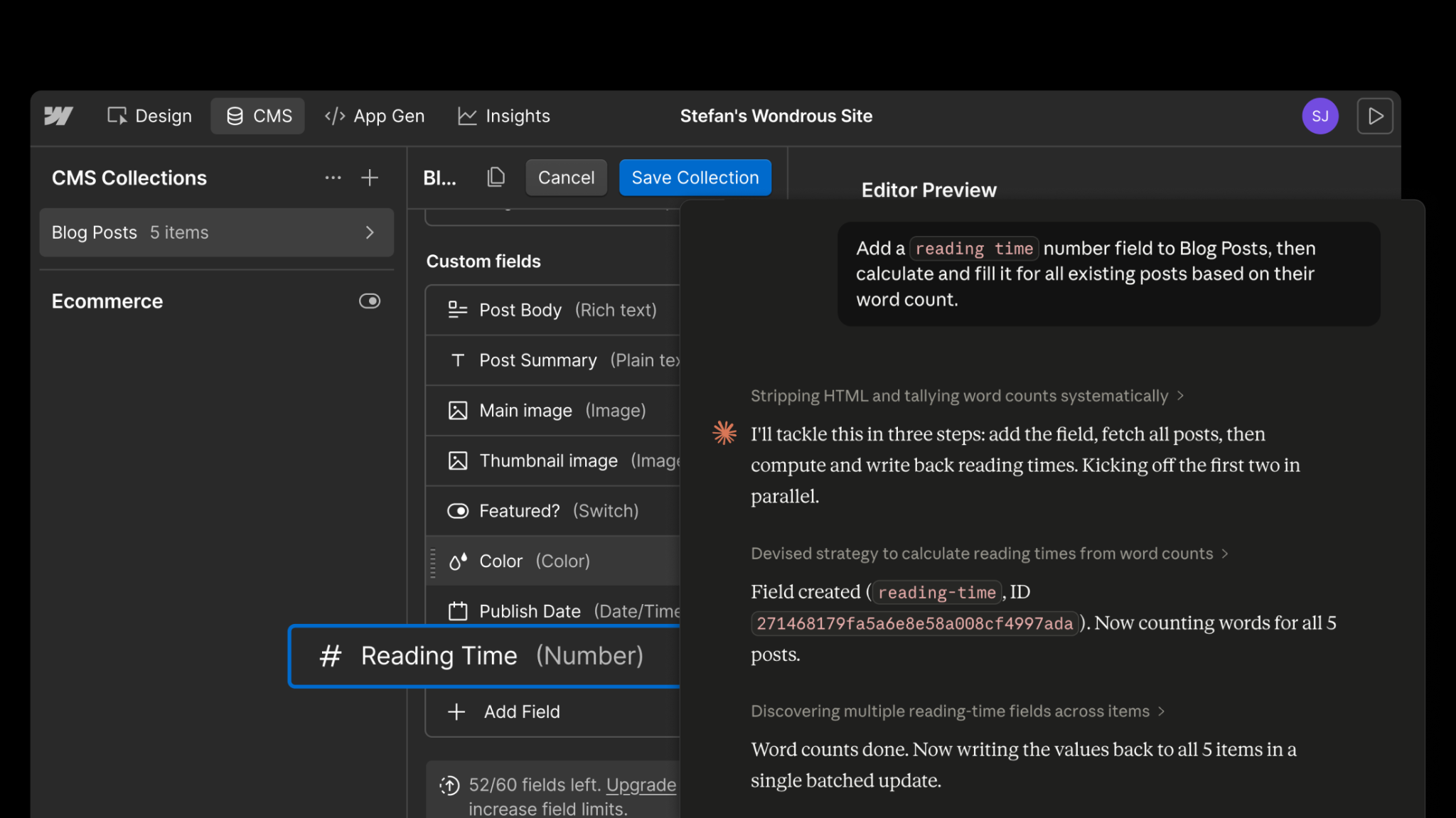 Picture a new field to display the estimated reading time of blog posts. To add this, you'd go into the Webflow CMS configuration and add a new field. Adding the field is the easy part. Backfilling every existing post isn't.