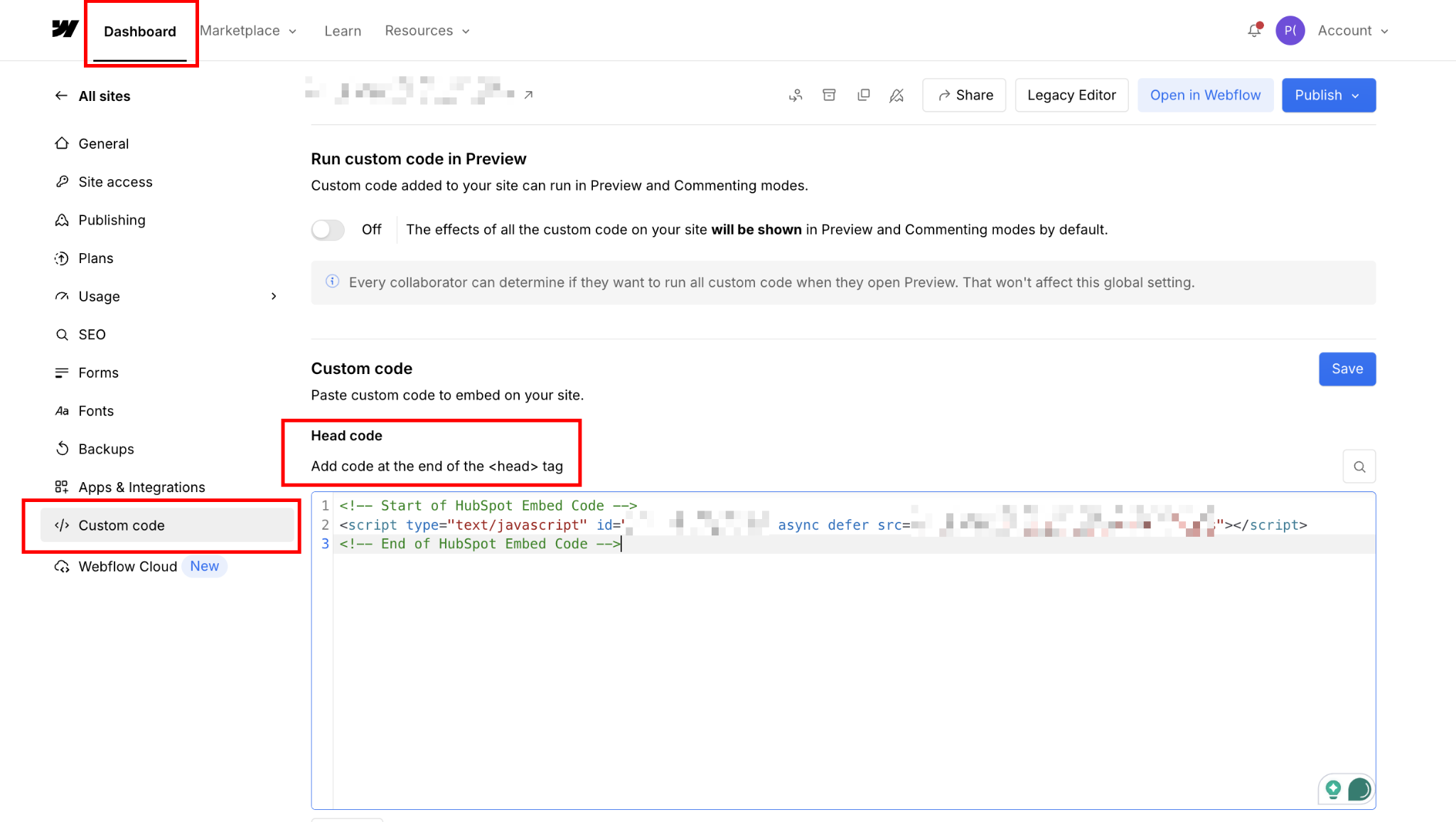 Custom code access is required to install the HubSpot tracking code on your Webflow site. This is available on paid Workspace plans (Core, Growth, Agency, or Freelancer) and on paid Site plans (CMS, Business, or Ecommerce).