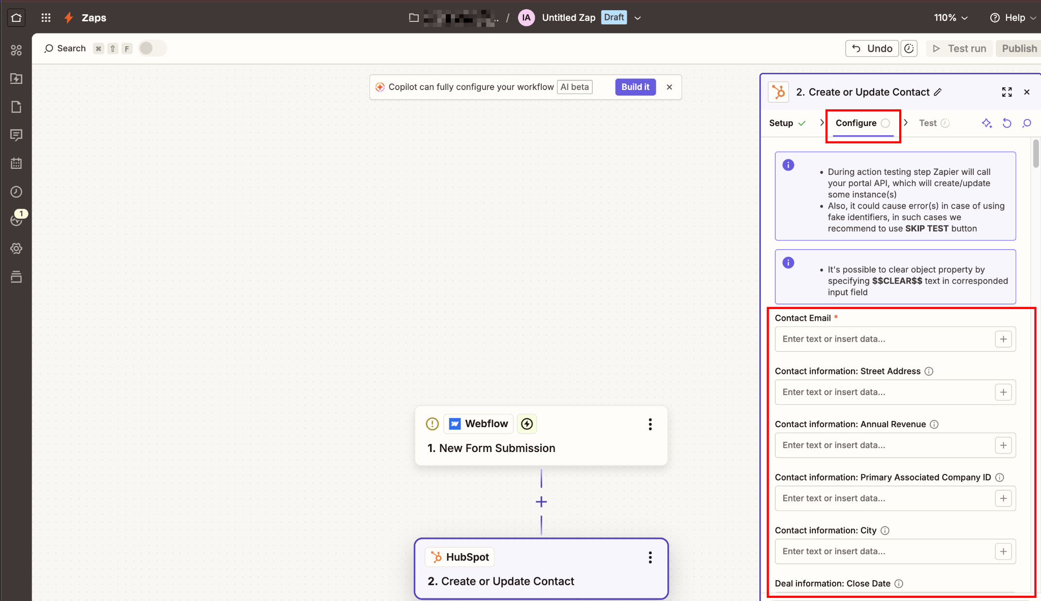 After that, in the Configure tab, Zapier displays the field mapping interface, where you'll specify which Webflow form data maps to which HubSpot contact properties. This mapping section contains dozens of available HubSpot fields organized into standard properties and custom properties.