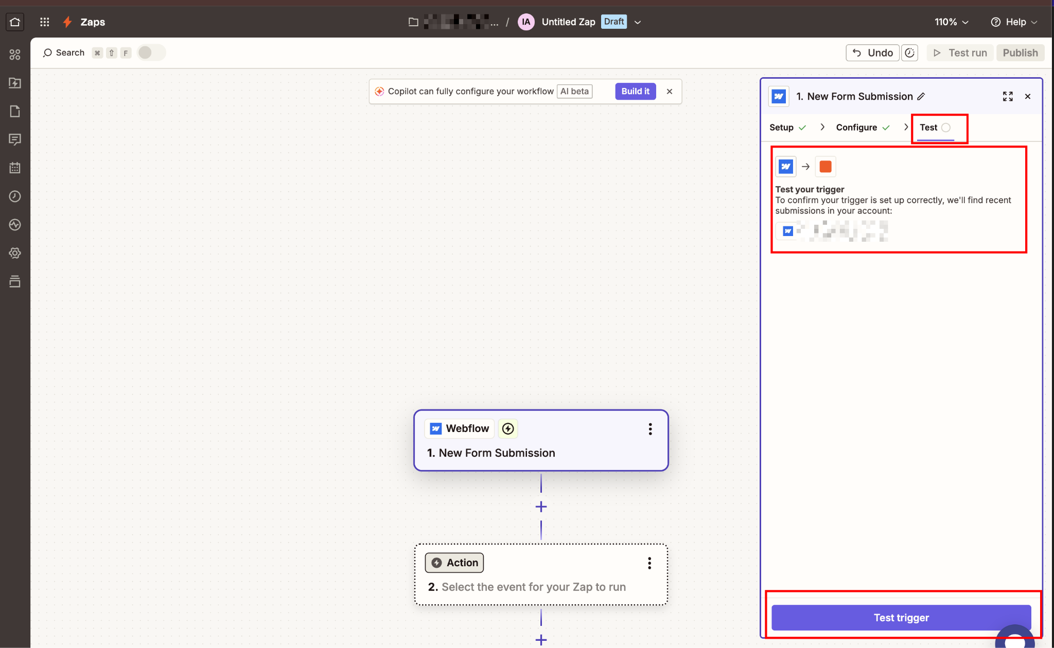 Click the "Test trigger" button at the bottom of the trigger configuration panel. Zapier queries Webflow's API to fetch the most recent form submission for the selected form.