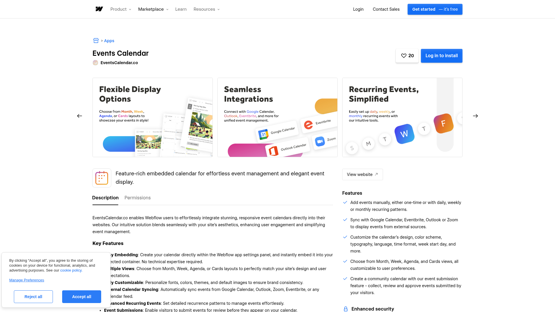 - Events Calendar app installs from the Webflow App Marketplace and handles calendar creation and embedding without writing code.